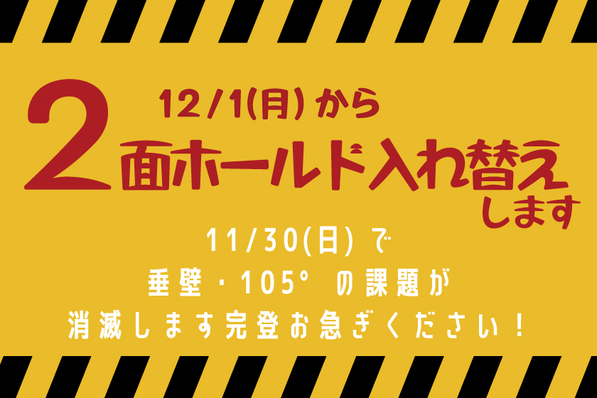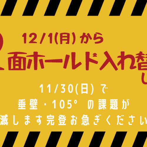 ホールド入れ替え 11月 30 Sun 2025 ホールド入れ替え営業時間 垂壁・105°の課題消滅します!完登お急ぎください! ホールド入れ替えのお知らせ 12/1(月)より垂壁・105°の2面の壁のホールド入れ替えを行います。 11/30(日)は営業時間を変更いたします。 Open 10:00 Close 18:00 前のスケジュール