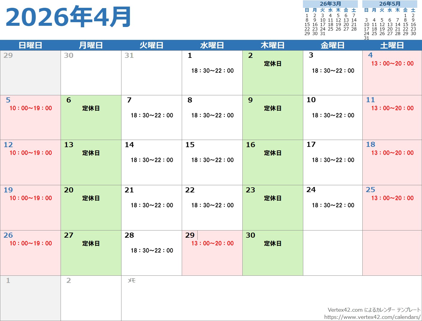 4月の営業カレンダー